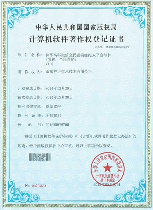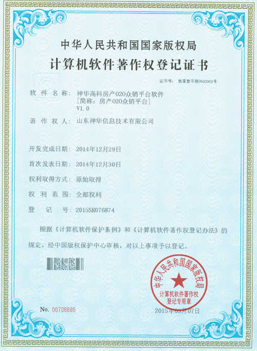近日,由山東中煤工礦集團旗下公司山東神華信息技術有限公司自主研發的兩項軟件獲得中華人民共和國國家版權局計算機軟件著作權登記證書。它們分別為:“神華高科微信全民營銷經紀人平臺軟件[簡稱:全民營銷]V1.0;神華高科房產O2O眾銷平臺軟件[簡稱:房產O2O眾銷平臺]V1.0。