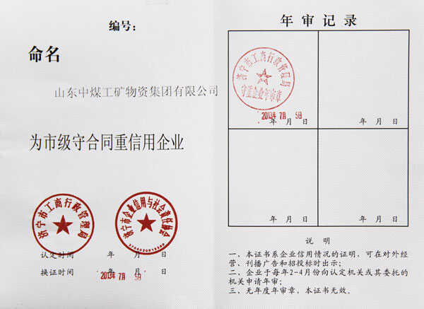 7月5日,經濟寧市工商行政管理局批準,山東中煤工礦集團榮獲2013年市級守合同重信用企業榮譽稱號。