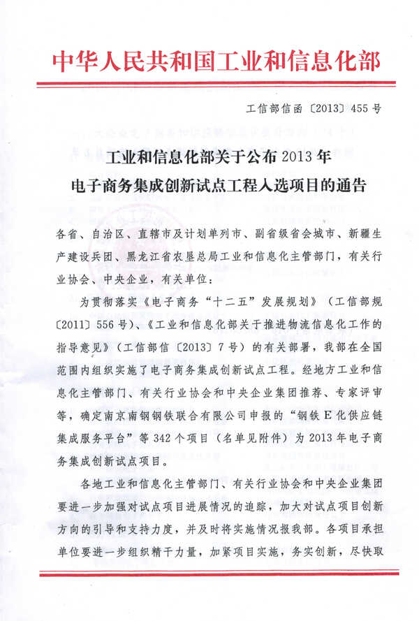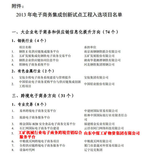 為貫徹落實(shí)《電子商務(wù)“十二五”發(fā)展規(guī)劃》(工信部規(guī)〔2011〕556號(hào))、《工業(yè)和信息化部關(guān)于推進(jìn)物流信息化工作的指導(dǎo)意見(jiàn)》(工信部信〔2013〕7號(hào))的有關(guān)部署,工業(yè)和信息化部在范圍內(nèi)組織實(shí)施了電子商務(wù)集成創(chuàng)新試點(diǎn)工程。經(jīng)地方工業(yè)和信息化主管部門、有關(guān)行業(yè)協(xié)會(huì)和中央企業(yè)集團(tuán)推薦、專家評(píng)審等,確定山東中煤工礦物資集團(tuán)有限公司為2013年電子商務(wù)集成創(chuàng)新試點(diǎn)項(xiàng)目入選企業(yè)。