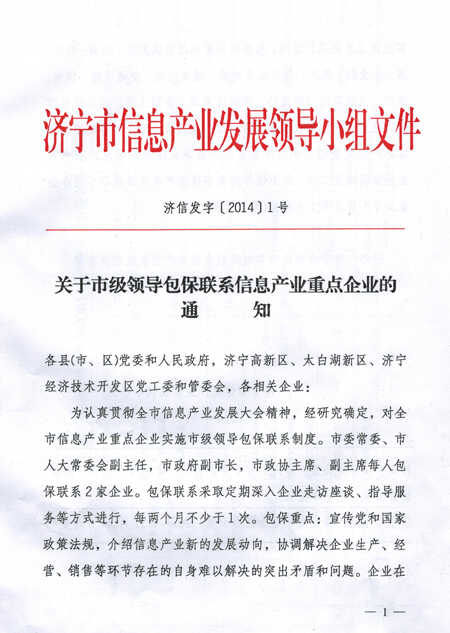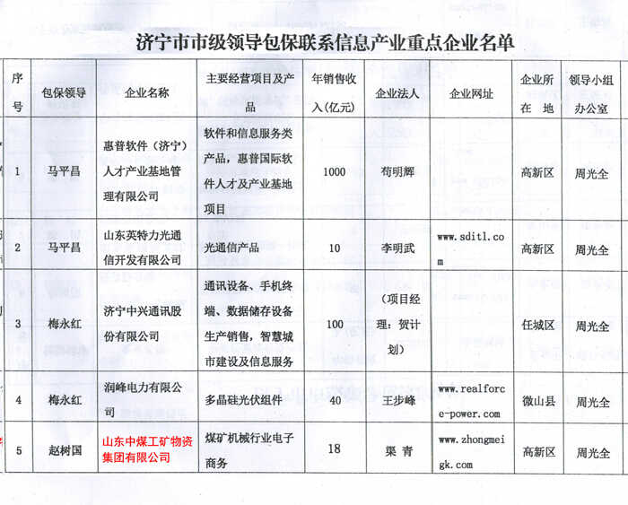 為加快推進全市信息產業發展,實現信息產業項目建設新突破,市委市政府決定對全市信息產業重點企業實施市級領導包保聯系制度。山東中煤工礦集團作為國家工信部電子商務創新試點企業、山東省電子商務示范企業、山東省電子商務認定企業、濟寧市重點培育的120家信息化與工業化融合企業、濟寧市信息產業重點示范項目企業等受到市委市政府高度重視,被列為市級領導包保聯系信息產業重點企業,由濟寧市政協主席趙樹國全面負責。